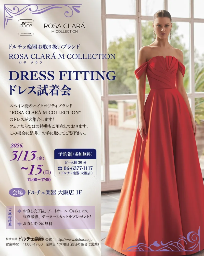 2026 3/13(金)〜15日(日)の3日間ドルチェ楽器大阪店にて新作ドレス試着会を開催します 。
